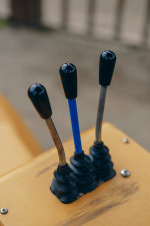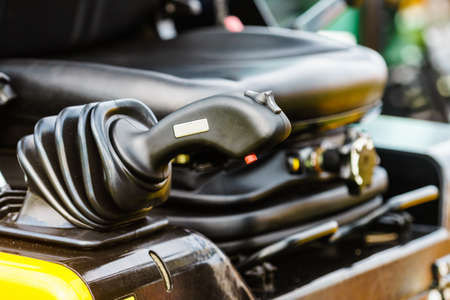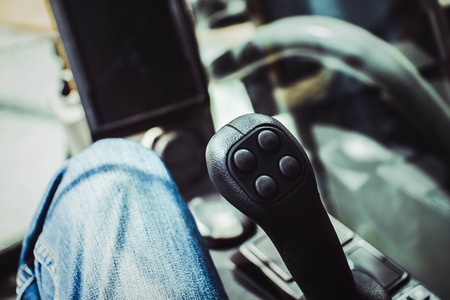 Detailed close up of gear stick in agricultural machine, big vehicle. Inside of truck trailer details concept.