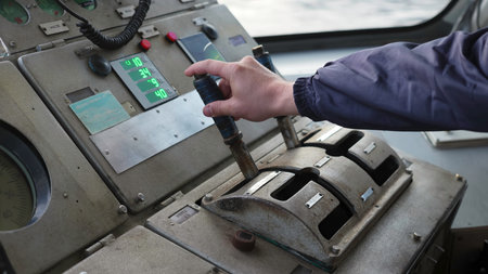Captain operating levers on ships bridge control panel. Clip