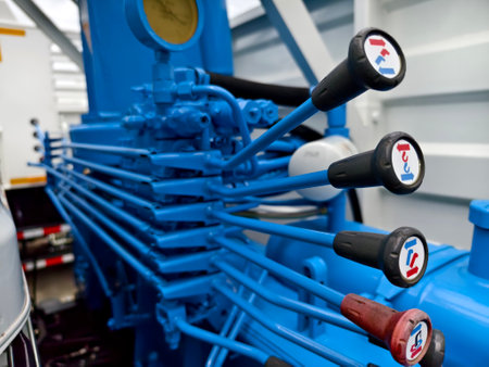 Close up of old crane truck hydraulic control