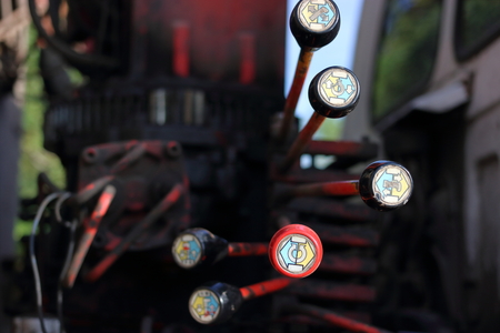 Close up detail of levers knobs on new tractor machinery industrial detail
