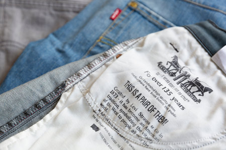 BANGKOK, THAILAND - JUNE 12, 2019: Close up of the details of Levi's Jeans. LEVI'S is a brand name of Levi Strauss and Co, founded in 1853.