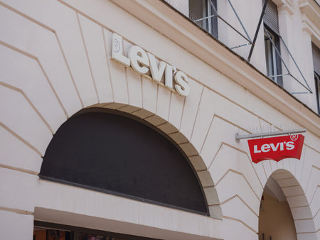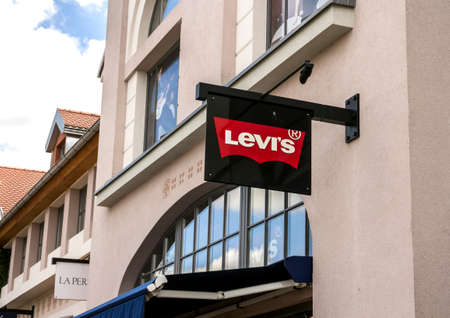 Munich, Germany - August 5, 2022: Shopfront logo of Levi Strauss Co at shopping mall. It is privately held American clothing company known worldwide for its Levis brand of denim jeans.