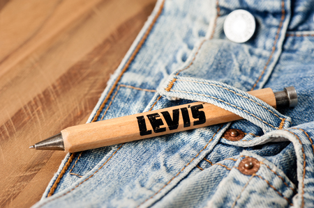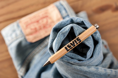 BANGKOK, THAILAND - NOVEMBER 01, 2016: An old wooden souvenir pen from LEVI's. LEVI'S is a brand name of Levi Strauss and Co, founded in 1853.