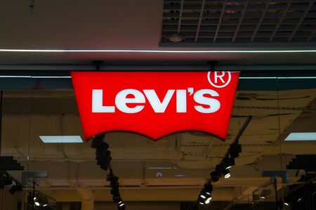 2021: Levis storesign on dark background. Levi Strauss & Co, american manufacturer of jeans and clothes, since 1853