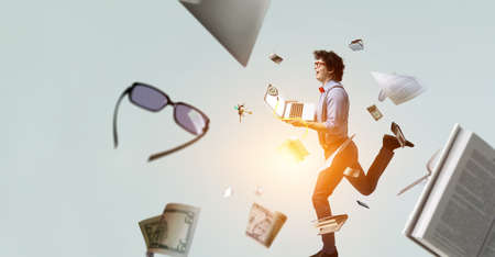 Handsome active young man dancing while jumping in the air