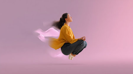 A serene image of a woman meditating in mid-air, surrounded by flowing fabric on a soft pink background, representing inner peace and mindfulness.