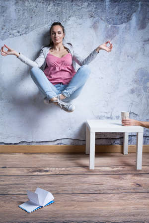 Meditating young woman levitating above ground