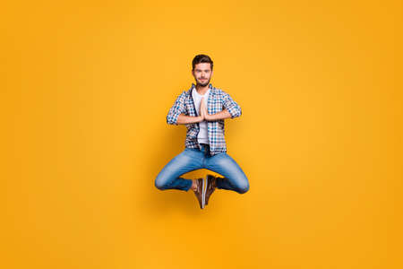 Full-body portrait of levitates in the air meditating and concentrating isolated on shine yellow background