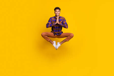 Photo of young man jump up meditate practicing relax dreamy fresh energy isolated over yellow color background
