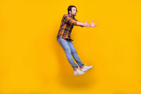Full body portrait of carefree dark skin guy jump hands palms pleading isolated on yellow color background