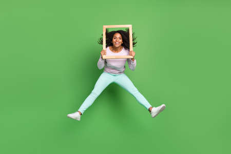 Full size photo of funky young brunette lady jump with frame wear pullover pants shoes isolated on blue background