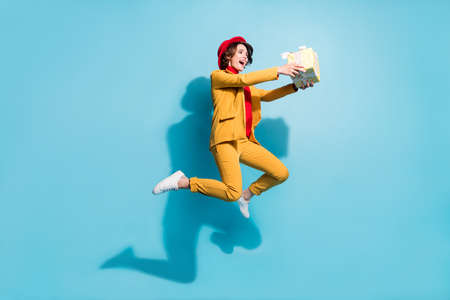 Photo of pretty sweet woman dressed red jumping holding present looking empty space smiling isolated blue color background