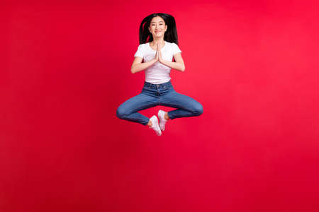 Full body of sportive pretty lady closed eyes meditate fly jump isolated on turquoise color background
