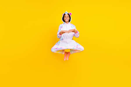 Full size photo of young black preteen girl read story materials jump study isolated over yellow color background