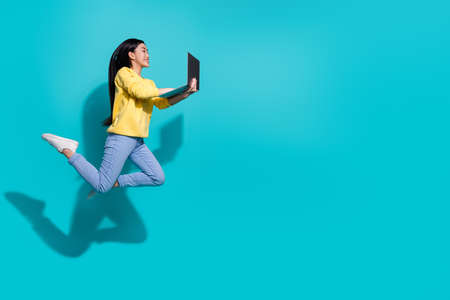 Full length photo of pretty funny lady dressed yellow sweater jumping working device empty space isolated turquoise color background