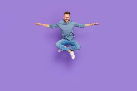 Photo of handsome fooling guy wear grey shirt jumping high arms sides isolated violet color background