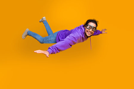 Young man in purple hoodie with goggles mimicking flying pose against vibrant orange background