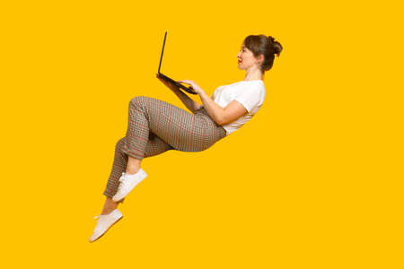 Freelancer woman. Girl with laptop smiling. Freelancer with a laptop. Freelancer works with a computer. Concept - a woman works remotely. Girl in weightlessness a yellow background.