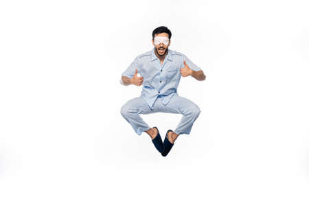 amazed man in blue pajamas and sleeping mask levitating while showing thumbs up on white
