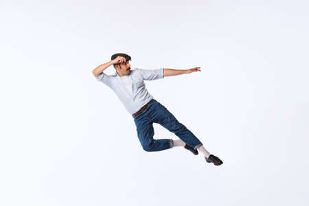 Young man falling down in mid-air with casual clothing against a blue background. Dynamic and active concept.