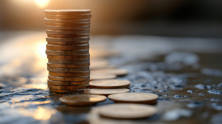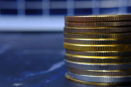 Coins money stack in finance treasury deposit bank account saving, corporate business economy and financial growth by investment in valuable asset to gain cash revenue. Forex trading economy.