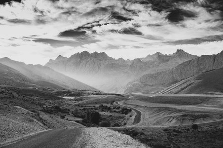 Beautiful landscape of mountains at sunset. Black and white photo.