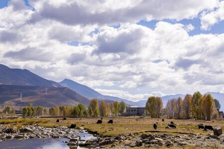 Beautiful sunset and meadow at Napa Lake Grassland, located in Zhongdian city ( Shangri-La). landmark and popular spot for tourists attractions in Yunnan, China. Asia travel and Autumn season concept