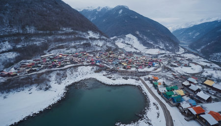A unique aerial view a colorful village bordering a heart-shaped lake within a vast snowy mountain range.