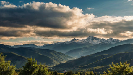 Mountain landscape with snow covered peaks in the clouds at sunset.