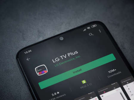 Lod, Israel - July 8, 2020: LG TV Plus app play store page on the display of a black mobile smartphone on dark marble stone background. Top view flat lay with copy space.