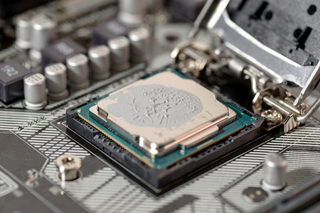 close-up Thermal compound on cpu chip in mainboard computer