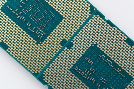 Computer processor CPU Central processing unit microchip isolated on white background Closeup the bottom side, socket contact for personal computer