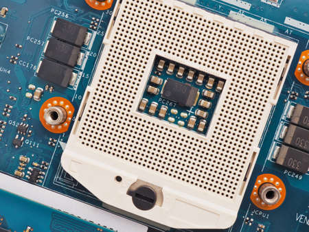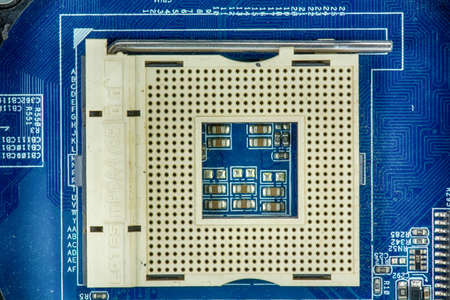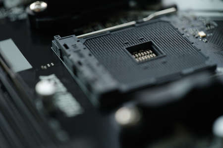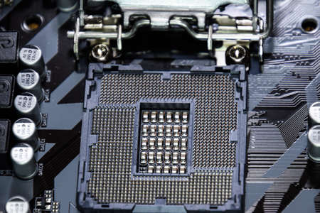 Computer central processor CPU socket close up. A fragment of the motherboard. view from above. Electronic and computing equipment and hardware. Macro