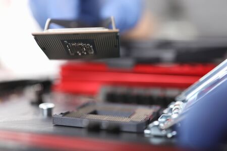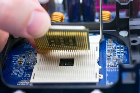 Detail of expert hands at processor replacement. Close-up of installation a central processing unit into a socket on computer mainboard. PC hardware maintenance. Working of technical support engineer.