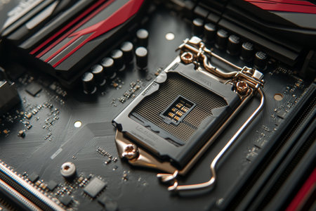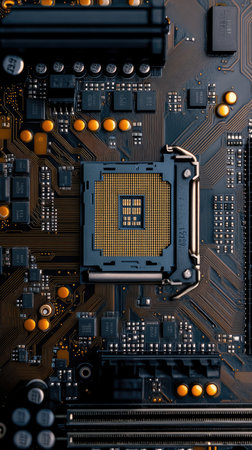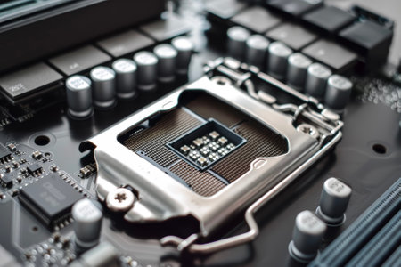 Close-Up of CPU Socket on a Modern Computer Motherboard. Electronic Small Component Details.