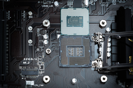 Detail of a CPU Processor over his Socket on a Motherboard. Printed Circuit Board - Computer Motherboard with Components. Close-up