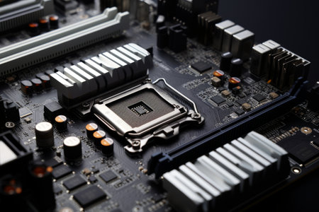 Closeup detail of CPU socket of a modern computer black motherboard. Electronic small component details. Select focus