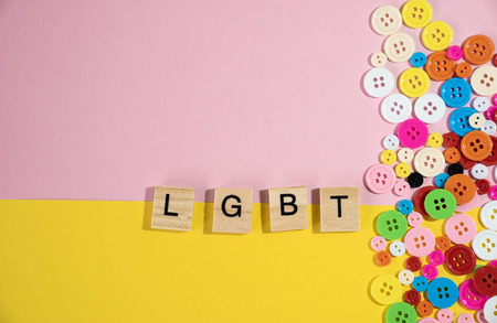 LGBT collected from elements wooden cube with colourful buttons on pastel pink and yellow background