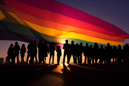 A striking silhouette image capturing a colorful parade of individuals proudly waving the rainbow flag, the symbol of love and tolerance. This powerful photo represents the LGBTQ+ community's spirit and the celebration of diversity and acceptance