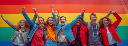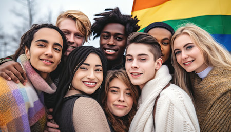 a varied group of young LGBT activists waving a rainbow flag and representing the gay and lesbian community