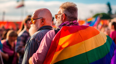 Celebrate the rich tapestry of diversity in this vibrant procession, where individuals proudly display flags painted in the colors of the rainbow. It's a powerful homage to the ongoing fight for equality and the rights of the LGBT community. illustration created by Generative AI