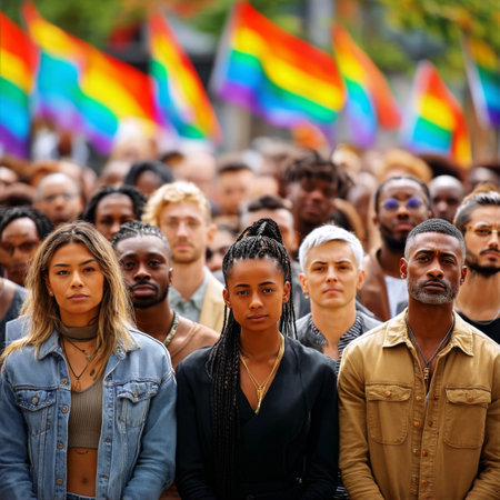 Diverse group of people standing together at a pride event with rainbow flags waving in the background celebrating love and acceptance in the LGBTQ community concept