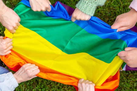 Group of people holding rainbow pride flag in a hands, gay and lesbian concept, LGBTQ