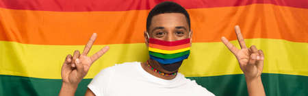 african american man in rainbow colors medical mask showing victory gesture on background of lgbt flag, banner