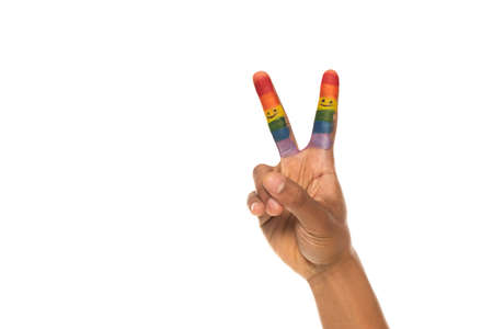 cropped view of african american man showing victory gesture with fingers painted in lgbt colors isolated on white