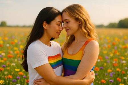 AI generated image of an Asian woman and European woman sharing a tender moment in a vibrant wildflower field wearing rainbow LGBTQ outfits under warm sunlight