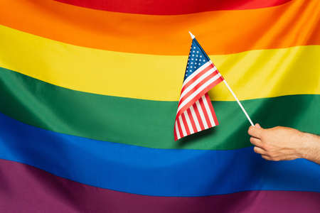 Fabric USA and gay pride rainbow flags as background, concept picture