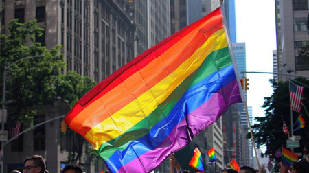 In city downtown, looking up to the sky, LGBT flag a rainbow colored flag. Generative AI image weber.