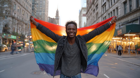 rear view unrecognizable man outdoors holding gay pride flag on his back with his hands, copy space.