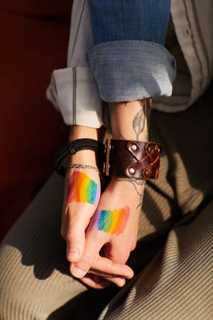 Low angle of a caucasian gay woman and a latin lesbian woman standing and holding hands with rainbow colored wristbands